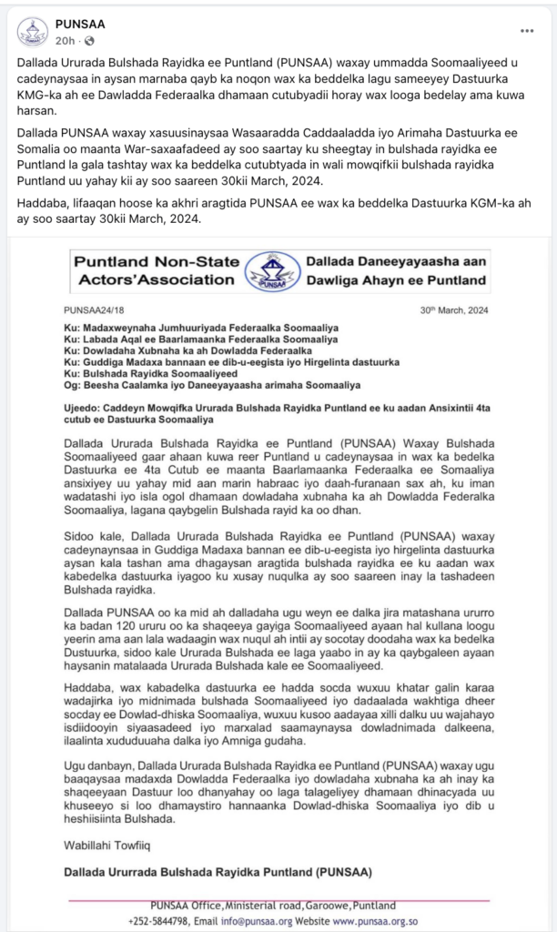War saxaafadeed kasoo baxay dalladda PUNSAA ayaa sidoo kale lagu caddeeyay inay “xasuusinayso Wasaaradda Caddaaladda iyo Arrimaha Dastuurka ee Soomaaliya, oo maanta soo saartay war-saxaafadeed ay ku sheegtay in bulshada rayidka Puntland ay ka qayb qaadatay wax ka beddelka dastuurka, in mowqifka bulshada rayidka Puntland uu weli yahay sidii ay ku caddeeyeen 30kii March, 2024.”