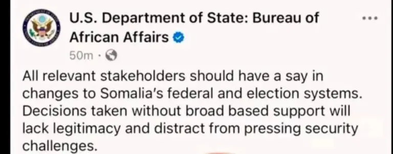 Muqdisho (KAAB TV) – Dowladda Mareykanka, ayaa sheegtay in dhammaan dhinacyada siyaasadda ee Soomaaliya looga baahan yahay in ay ka qayb qaataan isbeddellada ku saabsan nidaamka federaalka iyo doorasho loo dhan yahay oo Soomaaliya ka dhacda.