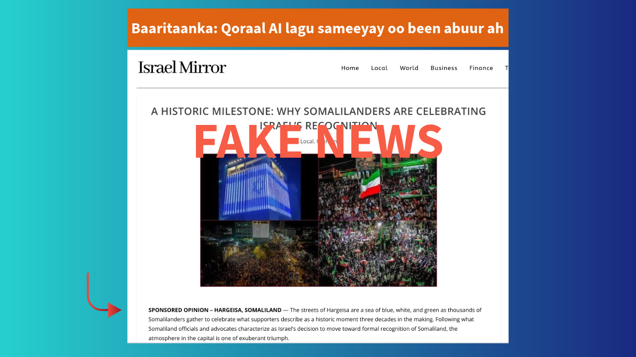 Qormada la faafiyay waa mid been-abuur ah, lacag lagu bixiyay, AI-na diyaarisay, laguna faafiyay si ula kac ah, iyadoo loo adeegsanayo shakhsiyaad xilal sare haya, taasoo halis ku ah xaqiiqada, wacyiga bulshada, iyo kalsoonida warbaahinta.