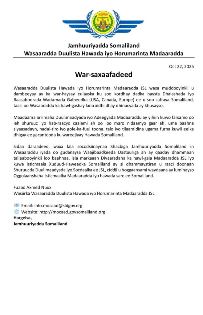 HARGEYSA (Kaab TV) – Wasaaradda Duulista Hawada iyo Horumarinta Madaarada ee Somaliland ayaa ka digtay in diyaaradaha weydiiya dadka u soo safra Somaliland Evisa-ha Soomaaliya inay lumin doonaan fasaxa ay kaga hawlgalaan Somaliland.