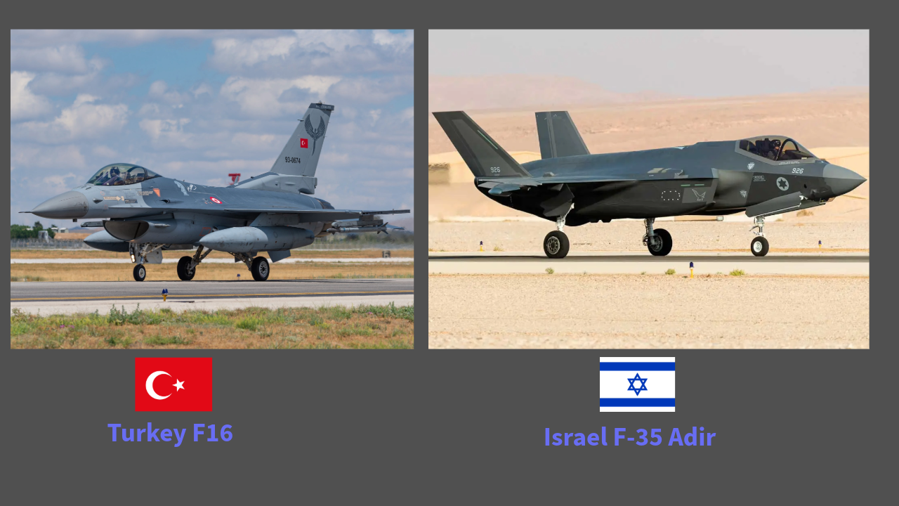 4- Halka ay Turkey ka adeegsato F16 (4th generation), waxay Israel haysataa F35 oo 5th generation ah (fiiri labada sawir ee hoose). Diyaaradda F35 nooca ay Israel sii hormarisay ee Adir, waxaa lagu tilmaamaa diyaarad awood badan, oo ka dhuuman karta raadaarka ay waddamo badan haystaan.