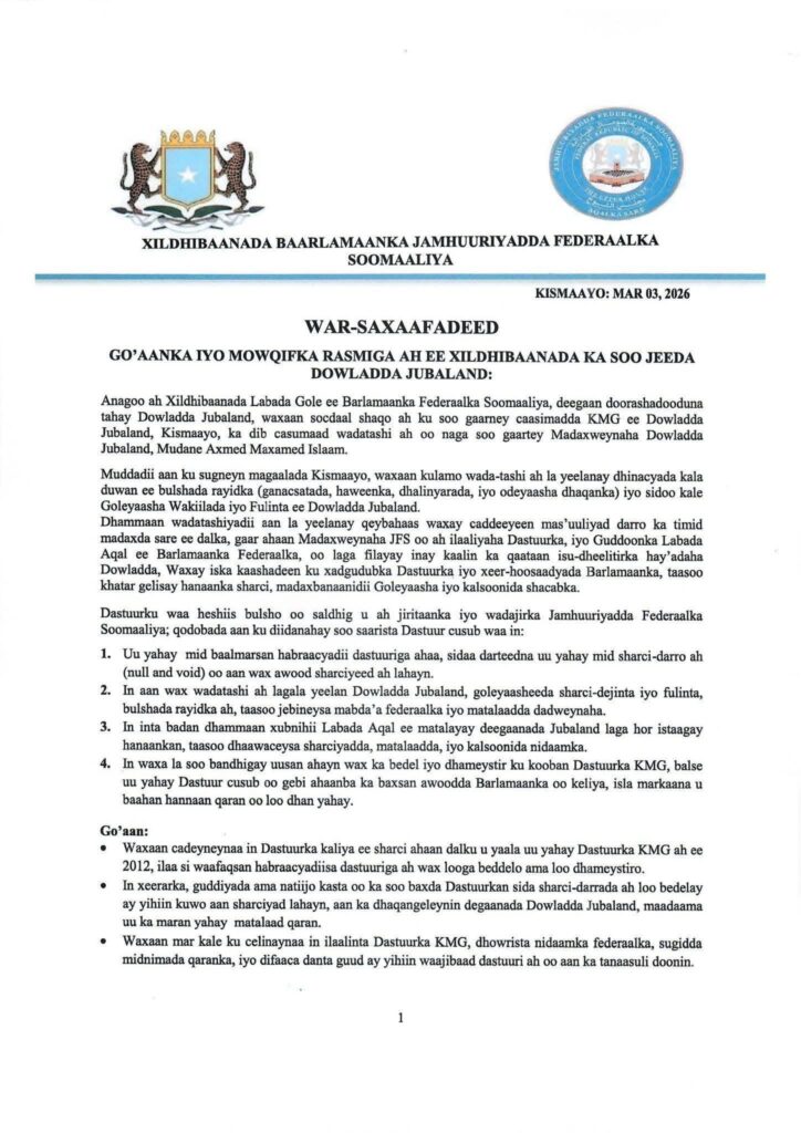 KISMAAYO (Kaab TV) – Xildhibaanada Labada Gole ee Barlamaanka Federaalka Soomaaliya, deegaan doorashadooduna tahay Dowladda Jubaland, oo socdaal shaqo ah ku soo gaaray caasimadda KMG ee Dowladda Jubaland, Kismaayo, ka dib casumaad wadatashi ah oo uu soo diray Madaxweynaha Dowladda Jubaland, Axmed Maxamed Islaam ayaa caawa soo saaray go’aan rasmi ah oo ay ku diiddan yihiin bedelidda dastuurka dalka.
