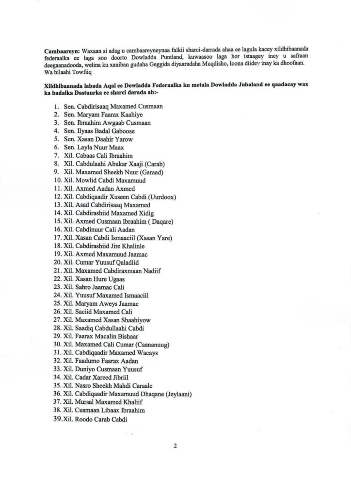 Xildhibaanada labada Aqal ee Dowladda Federaalka ku metala Dowladda Jubaland ee qaadacay wax ka badalka Dastuurka ee sharci darada ah:-