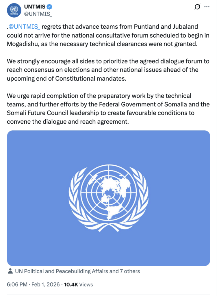 “Xafiiska QM wuxuu muujinayaa sida uu uga xumaaday in wufuuddii hordhaca ahayd ee Puntland iyo Jubaland aysan soo gaari karin Madasha Wadatashiga Qaran ee lagu waday inay ka furanto Muqdisho, kaddib markii aan la bixin oggolaanshihii farsamo ee loo baahnaa,” ayaa lagu yiri qoraal ka soo baxay Qaramada Midoobay.